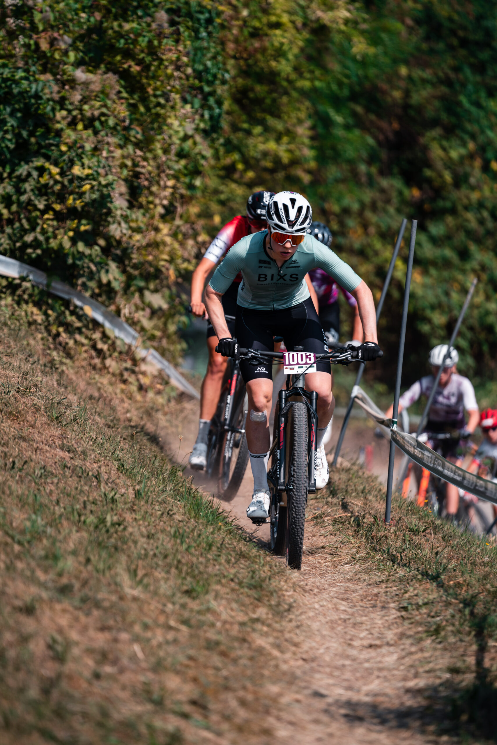 Da niemand anderes führen will und ich allein im Wind fahren muss, gibt es eine gemütliche erste Bahnrunde. Vor dem Ausgang der Pferderennbahn wird das Tempo erhöht, da die Strecke weniger Platz bietet. Kurz darauf ergreift Alessandra Keller die Initiative und drückt dem Rennen den Stempel auf. Der Birs entlang preschen wir Richtung “Bananenbrücke”. Beim Anstieg zum Gempen Nord Trail forciert Alessandra nochmals das Tempo. Sie macht also ernst und hämmert den Anstieg hoch, gefolgt von Ronja Blöchlinger und mir. Doch es gelingt ihr vorerst nicht, ihre ärgsten Widersacherinnen abzuschütteln. Für eine gewisse Vorselektion reicht es aber.