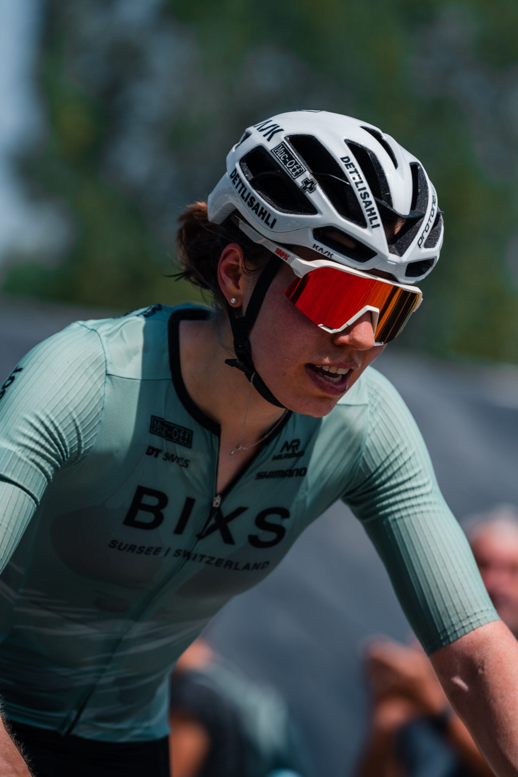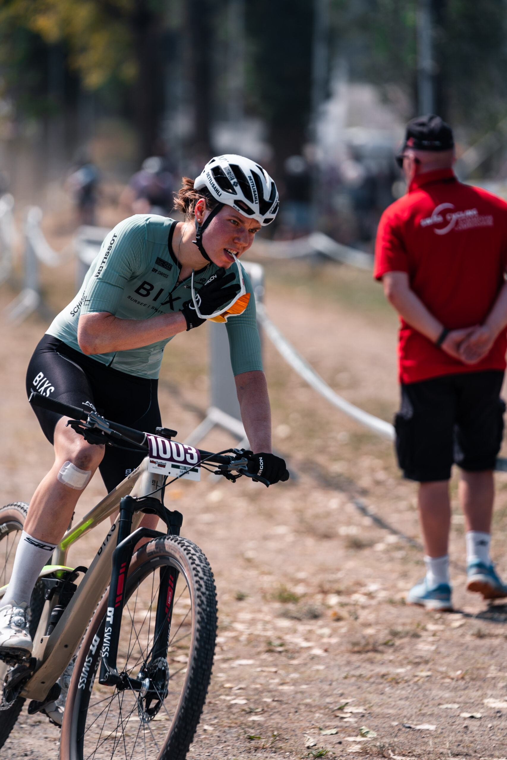 Zurück im Schänzli, fällt das Tempo wieder zusammen. Niemand reisst sich um die Führung, wodurch bereits abgehängte Fahrerinnen wieder aufschliessen und nach vorne fahren können. Als Alessandra im Anstieg erneut das Tempo verschärft, befinde ich mich an der nicht optimalen fünften Position. Eingangs Wald gelingt es mir, eine Fahrerin zu überholen. Die Schweizermeisterin drückt dermassen aufs Tempo, dass bereits Lücken aufgehen. Nun muss ich mit einem Extra-Effort versuchen, wieder zu ihr aufzuschliessen. Angepeitscht von meinen Fans jage ich ihr nach. Bis oben habe ich alle anderen Fahrerinnen überholt, doch die Nidwaldnerin hat bereits einen ordentlichen Vorsprung. Also begebe ich mich auf die Verfolgung und lege mich ordentlich ins Zeug, um wieder zu ihr aufschliessen zu können.